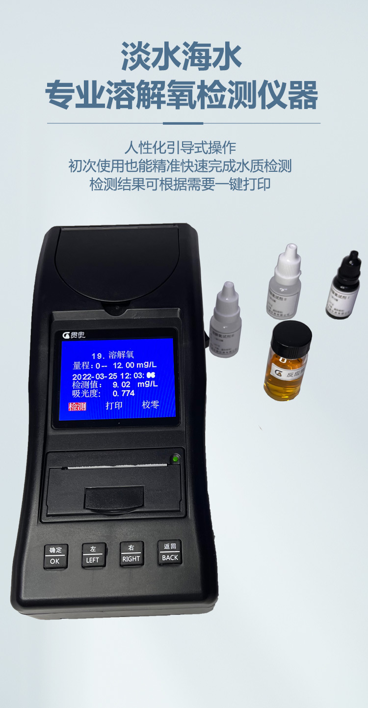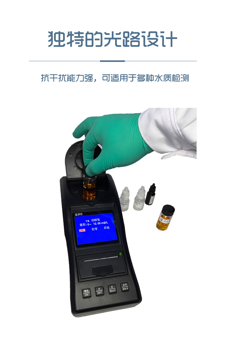 3、溶解氧测试仪采用分光光度的光电比色原理,操作简便,取水样放入试剂反应几分钟即可读数,重复性≤±2%。